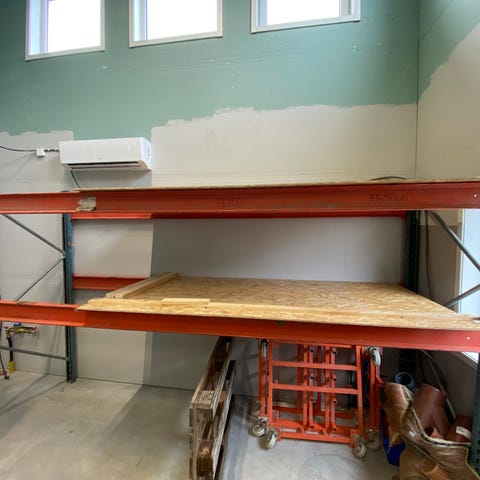 Bord 1 har eldriven höjning, hurts för verktygsförvaring, hylla, 3-fasuttag samt flera eluttag.