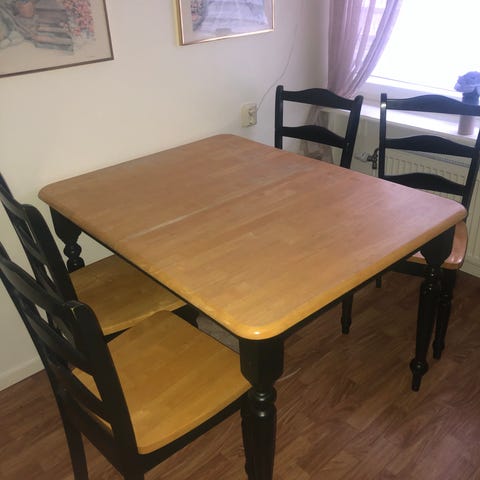 Säljer en fin matgrupp med 3 stolar. Bord har några skador men används utan problem. Priset för hela matgruppen är 300 kr men priset kan diskuteras vid snabb affär. Hämtas i Angered,