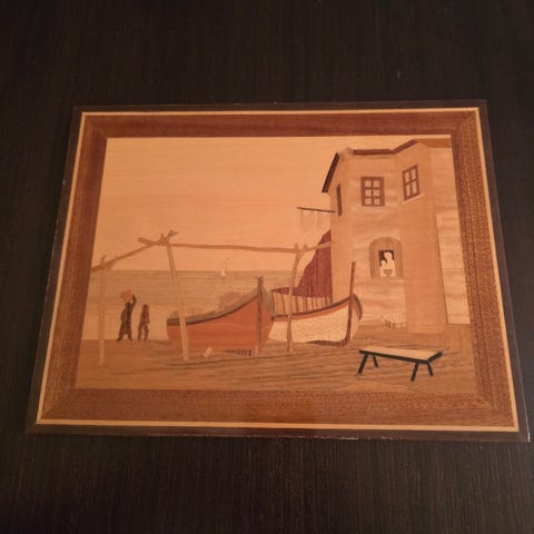 Sökord: intarsia, träinläggning, italiensk hantverk, Sorrento, Positano, Amalfi, träkonst, träbild, italiensk tavla, marquetry, wood inlay, Italian inlaid wood, vintage, hantverk, konst, retro, souvenir, kustmotiv, medelhavet, Italy art, träpanel