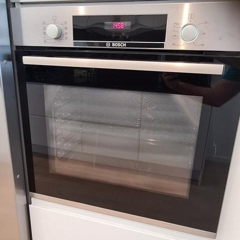 Bosch - IKEA inbyggnadsugn i rostfritt stål med flera ugnsgaller och digital display. Ugnsutrymmet är rymligt och utrustat med flera hyllplan för flexibel matlagning.