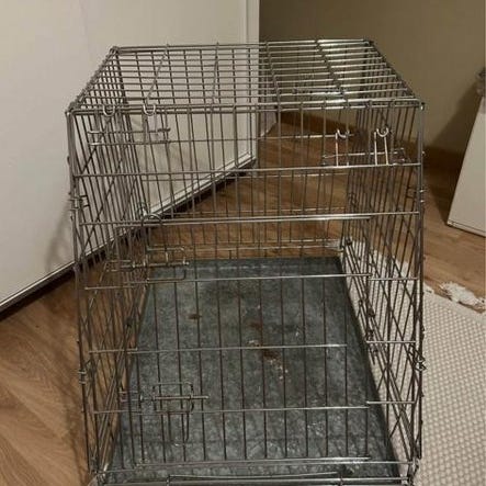 Stor hundbur. 90 cm lång, ca 65 bred och hög. För att den skall passa i fler bilar har jag gjort gavlarna något lutande. Då kommer man närmare ryggstödet för baksätet, samt klarar mer sluttande baklucka. Därför är tyget mindre spänt än om den inte blivit modifierad. Min collie hade hur mycket plats som helst.