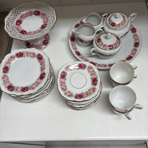 Zeh Scherzer servis från Bavaria Germany. 15 st kaffekoppar, 18 st kaffekoppsfat, 16 st assietter, 1 kanna till kaffe, 1 sockerskål och 1 gräddkanna. Vissa delar har små nagg.