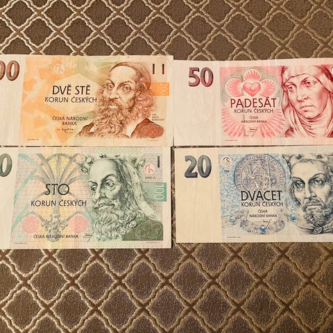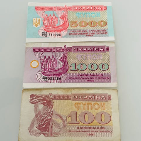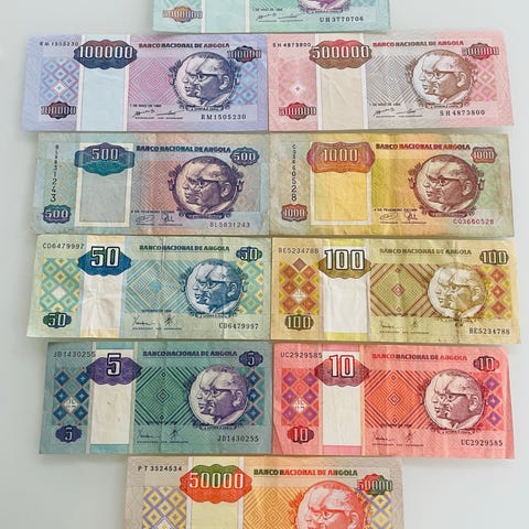 Samling av kroatiska dinarer. Inkluderar sedlar med värdena 1, 5, 10, 25, 100 och 50000.