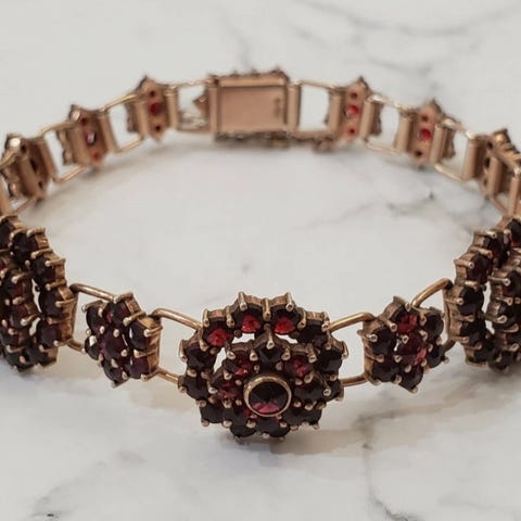 Brosch med granater i guldpläterat silver. Metallen har mörknat något.