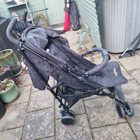 Praktisk resevagn av märket Moweo. Den är lätt att fälla ihop och tar upp liten plats i bagaget. Ryggstödet är fällbart och suffletten går att fälla ner för extra skydd på sol och regn.