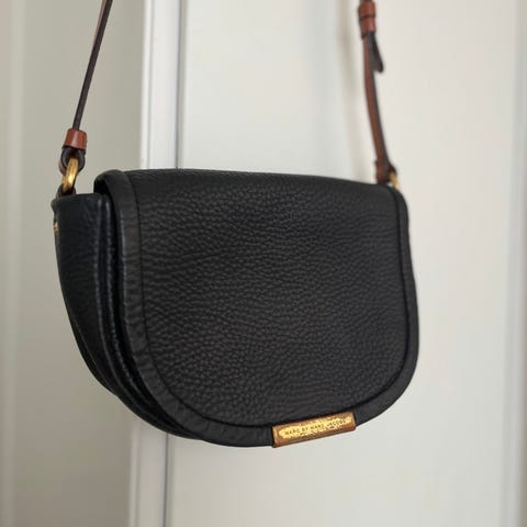 (Kan diskutera pris) Marc Jacobs Axelremsväska i läder, beige färg, unisex modell. Väskan har en justerbar axelrem med Marc Jacobs-logotyp och metallbeslag i guldton. Flera fack med dragkedja för förvaring av personliga tillhörigheter