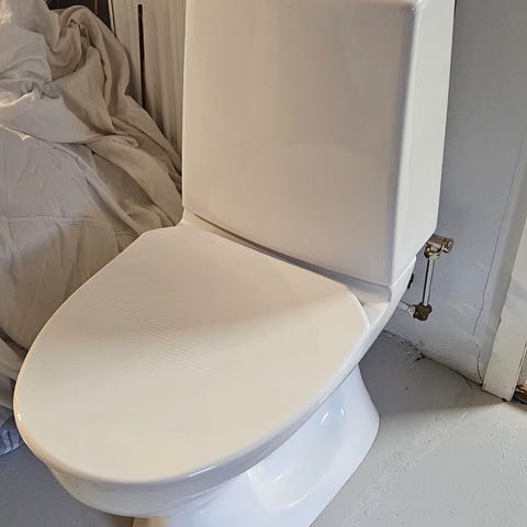 Bärbar toalettstol i vitt med armstöd och avtagbar sits.