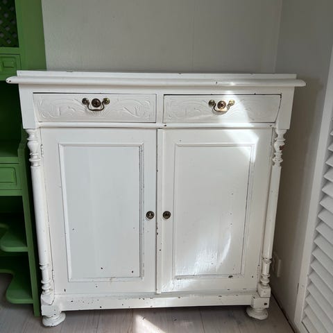 En äldre skänk som slipats och målats i vitt. Ena beslaget på vänster låda har gått sönder, går att byta ut om man så vill.