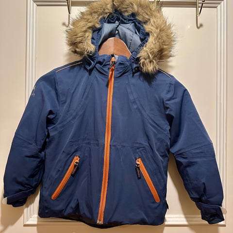 Mörkblå fodrad jacka. Vattentät. Använd, men mycket kvar. Nån fläck.