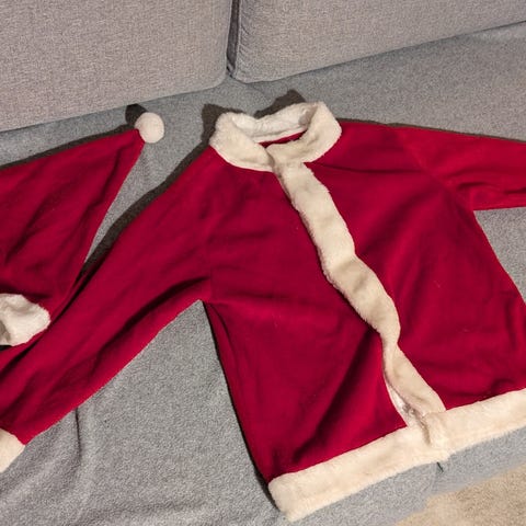 Tomtedräkt i plysch i storlek 92. Den har en huva som sitter fast i tröjan så ingen separat luva. Sparsamt använd och i fint skick.