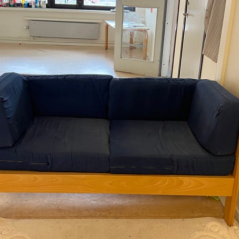 Fin blå barnsoffa lämplig till barnrum, har några småflläckar men inget större, tyget på kuddarna är avtagbart. Borstad sammet. Sitthöjd för barn