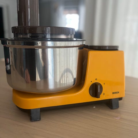 Äldre köksmaskin som startar. Köttkvarn och vispdel. Degkrok.