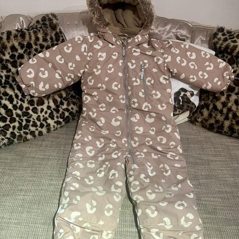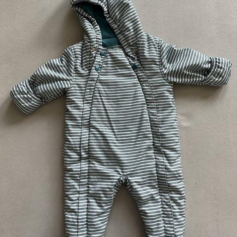 Hel och fin vinteroverall. Avtagbar luva. Inga fläckar. Inget namn. Se bilder för fothällornas skick. Nypris 1300 sek.