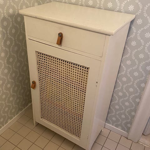 Stiligt Burton skåp i vitlackad MDF/spånskiva med underrede i metall. Skåpet har 2 dörrar. Handtag i brunt läder. Nyskick.