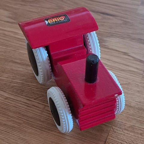 En leksaksgrävmaskin i plast. Perfekt för barn som gillar att leka med fordon.