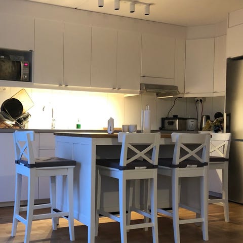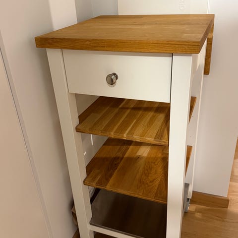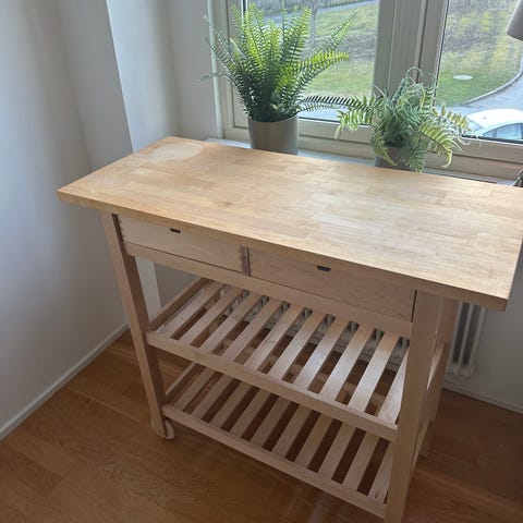 Fint skick! Stadig och pålitlig möbel. Funkar utmärkt mitt i rummet eller längs väggen som extra köksbänk.
