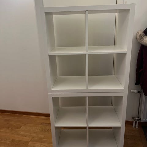 IKEA hyllor, tillverkade i vit metall med perforerade hyllplan. Hyllan har flera nivåer för förvaring och organisering av olika föremål. Passar för användning i hem eller kontor där luftig och lättillgänglig förvaring önskas.