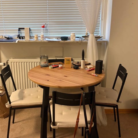 Säljer hela matgruppen (bord + stolar) pga flytt. Bordet har några ytliga repor/fläckar men stolarna är i väldigt gott skick. Säljer helst alltihop tillsammans men går att diskutera, finns att hämta i Västerås!