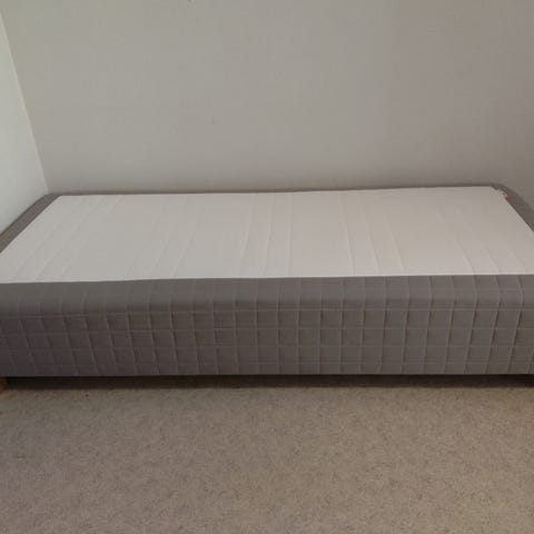 Jysk sängram med madrass, svart tygklädsel och träben. Passar för enkelrum eller gästrum och erbjuder en enkel sovlösning med modern design.