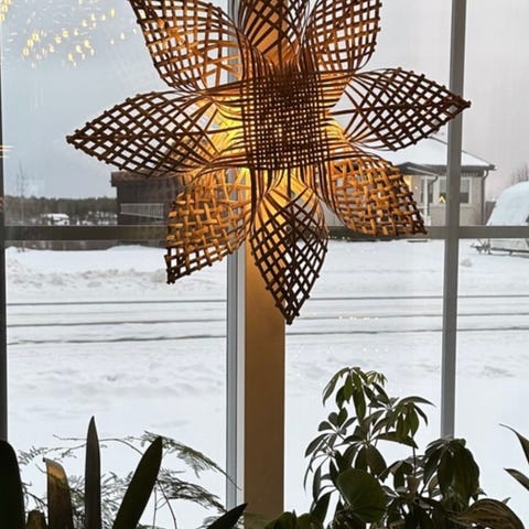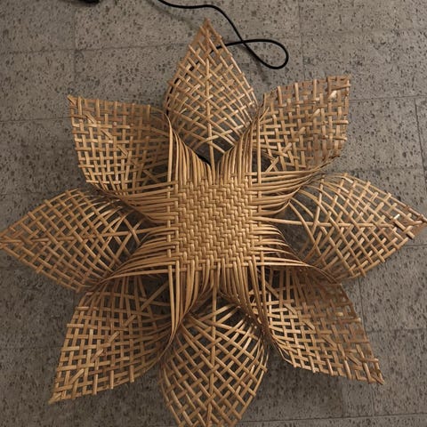 PR Home adventsstjärna Mary, handgjord i rotting och Abaca bark. Helt i nyskick förutom liten tryckskada på barken som varit från början, syns inte när den hänger uppe. Mått 66 cm.