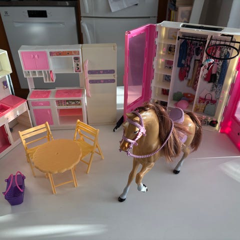 Barbie, litet dockhus och tillbehör inklusive möbler, dockor och olika tillbehör.
