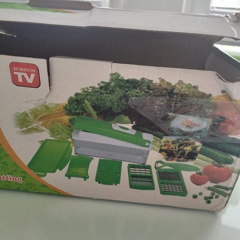 En Alligator lökskärare med en uppsamlare. Tärnar grönsaker eller annat i stänger eller tärningar i måtten 6 x 6 mm. Den är idealisk för att skära lök, frukt och grönsaker, t.ex. till sallad eller pyttipanna.