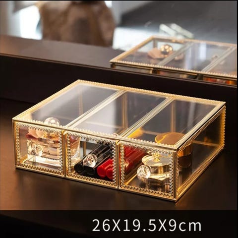 Säljer en praktisk förvaringsbehållare med två glasbehållare (glas) och mittendel i plast. Perfekt för sminkborstar, bomull, tops, pennor, skrivbord eller badrum. Stilren och fräsch design
