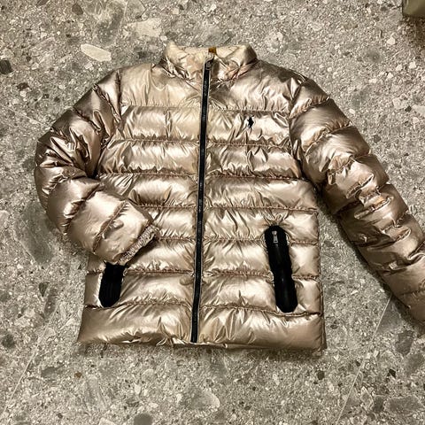 Ralph Lauren Polo dunjacka för barn i storlek 40. Jackan är blå och tillverkad av dunmaterial. Den är unisex och har huva med pälsdetalj. Passar för kallare väder.