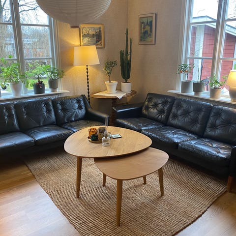 Vintage lädersoffa & fåtölj brun med TV-bänk och tillhörande bord
