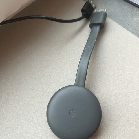 Google Chromecast Streaming-enhet i svart färg. En liten och kompakt enhet för strömning av media via HDMI. Har USB-C-port för strömförsörjning. Passar för användning med TV eller skärm för att strömma innehåll från kompatibla enheter.