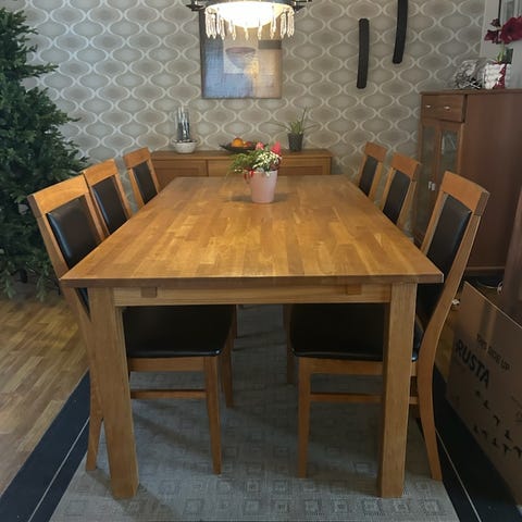 Massivt ekbord B90xL155XH74 + 2 tilläggsskivor á 50 cm + 6 stolar med svart skinnsits, 3500:-.