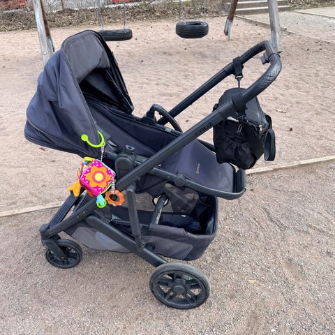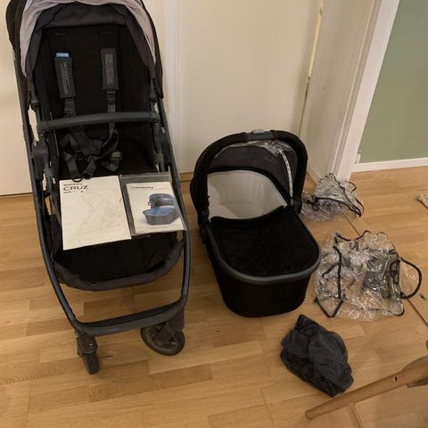 Uppababy barnvagn med mellangrå tyg. Vagnens ram är svart och den har fyra hjul,