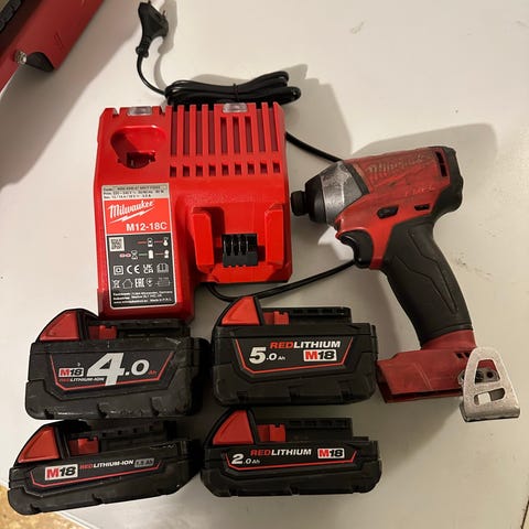 Milwaukee M18 Slagborr och slagskruvdragare med två 5.0Ah batterier och laddare i en förvaringsväska.