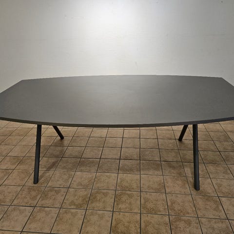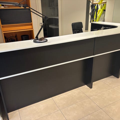 Amiga Receptiondisk med bågformad design, tillverkad i trä och metall. Passar för användning i kontors- eller receptionsmiljö. Har en kombination av träytor och perforerad metallpanel.