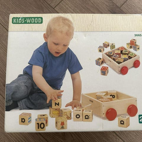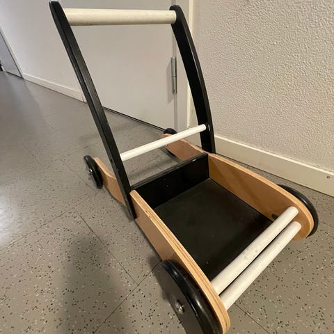 Trä Vagn med svarta handtag och röda hjul