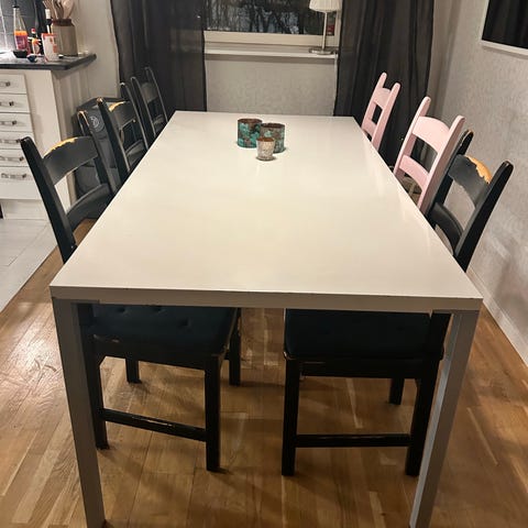 Säljer ett stort matbord med 6 stolar från NOVASOLO. Möblerna är ca 10 år gamla och är stabila och bekväma. Bordet och stolarna är målade i vitt. Perfekt för någon som vill fräscha upp möblerna med lite färg eller använda dem som de är.
