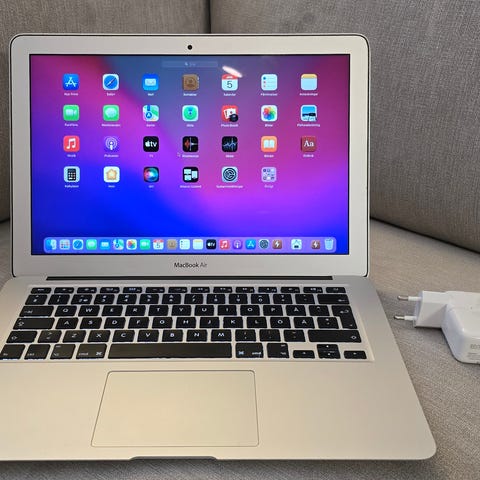 Apple MacBook Air 13 tum Silver med Intel Core i5-processor, 8 GB RAM och 256 GB SSD-lagring. Modellen är från mitten av 2013 och kör macOS Monterey version 12.0.1. Inkluderar laddare. Laptopens skärmstorlek är 13 tum och färgen är silver.