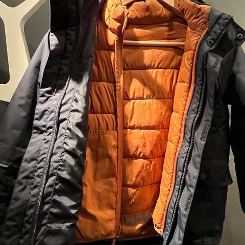 3-i-1 vinterjacka, skaljacka, puffig jacka. Smidig att sätta ihop/ta isär. Använd av ett barn. Det finns en pytteliten reva på höger arm - kolla bilden. Har inte stört funktionen, men borde gå utmärkt att lappa (PoP har bra laglappar).