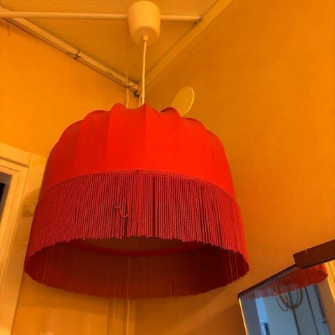 Två nya handgjorda lampskärmar från engelska Fermoie i deras egna handtryckta tyg. Rött mönster på benvit botten.