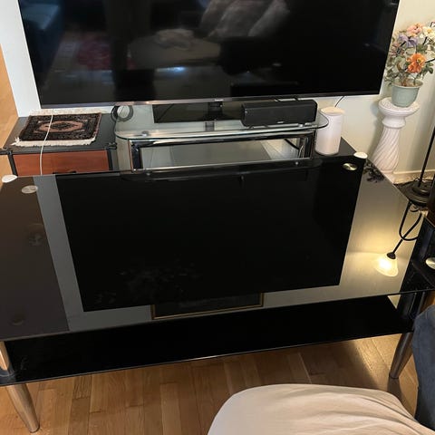 Säljer ett soffbord från Mio med trästomme och glasskiva.