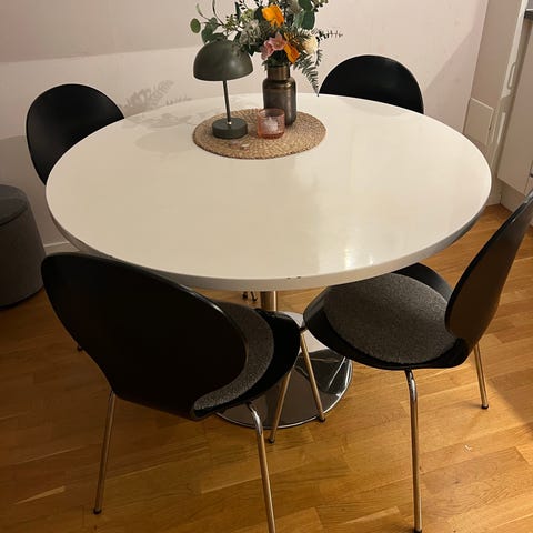Svart runt matbord, 140cm i diameter. Lite ytslitage finns men annars jättefint!