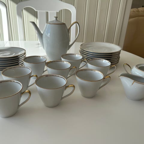 Jättefin matservis med guldkant och grå bård i absolut toppskick.