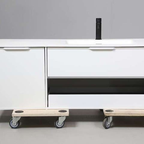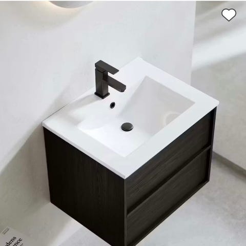 Vask: i sluttande modell Zura från Kuma med handukshängare i höger sida (obs! vaskmodell som går ej att stänga för bottenventilen för att spola upp vatten). Materialet är en komposit, kallad Rector, i färgen Dusty white.