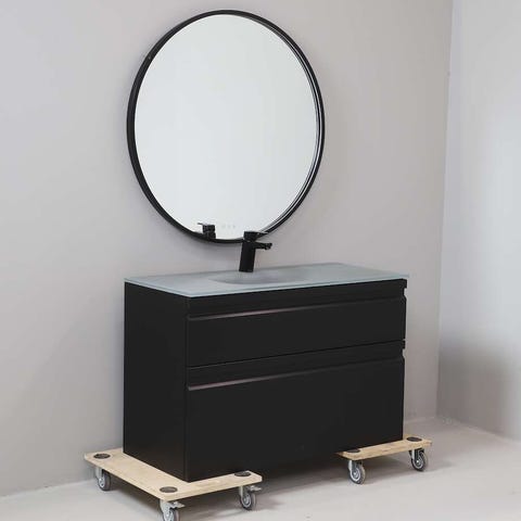 Badrumsinredning, komplett med kommod, vask, blandare och spegel med belysning i.