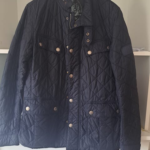 Quiltad mörkblå jacka från Barbour i storlek M. Klassisk look med tryckknappar, ståkrage och två stora fickor framtill. Jackan har Barbour-logga på armen och är tillverkad i lätt polyester, perfekt för höst och vår.