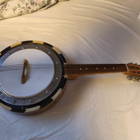 Tillverkad i USA, levereras med tidsenligt grått softshell-fodral. Hals i lönn, birdseye-lönn i ramen, tre prickar på greppbrädan, naturlig finish. Tillverkad av det legendariska företaget Slingerland, mest känt för sina trummor. Naturligt skinnhuvud som byttes ut i vår verkstad för cirka 5 år sedan. Hemgjord lönn-stall, 12 skruvar.