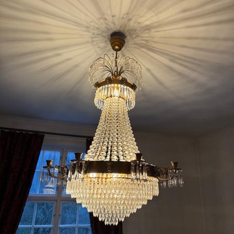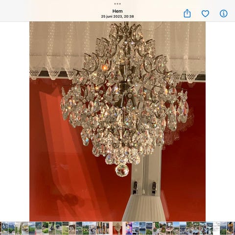Tät och fin kristallkrona. Sex yttre lampor samt tre i mitten. Böhmisk kristall. El omdragen. Två prismor något skadade. En prisma lossnat men är hel och alla delar finns kvar.