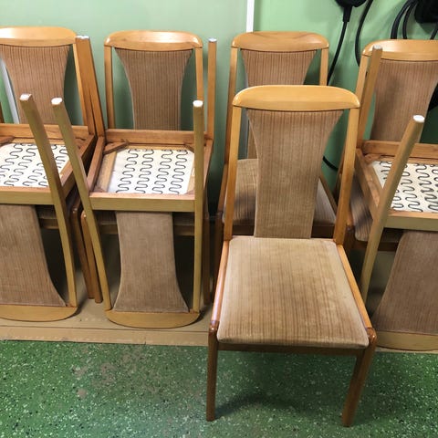 12 begagnade trästolar i vitt med stoppad sits i olika färger. Flera stolar har gråa stoppad sits och den andra har vita stoppad sits. Stolarna har en klassisk design med ryggstöd och är lämpliga för matplats eller kök.