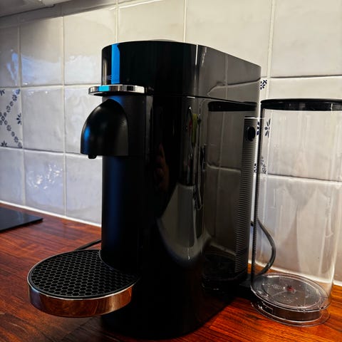 Nespresso Vertuo Next kapselkaffemaskin i svart färg. Maskinen är designad för att användas med Nespresso kapslar och har en kompakt och modern design. Den har ett avtagbart vattenreservoar i transparent plast och en droppbricka för att samla upp spill. Maskinen är lämplig för hemmabruk och kan brygga olika kaffestilar beroende på kapseltyp.