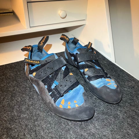 La Sportiva Tarantula klätterskor i Night blue/Moss färg. Skorna har en sluten tådesign och kardborreband för justerbar passform. De är tillverkade av syntetiska material och gummi för grepp och hållbarhet. Passar för inomhus- och utomhusklättring.